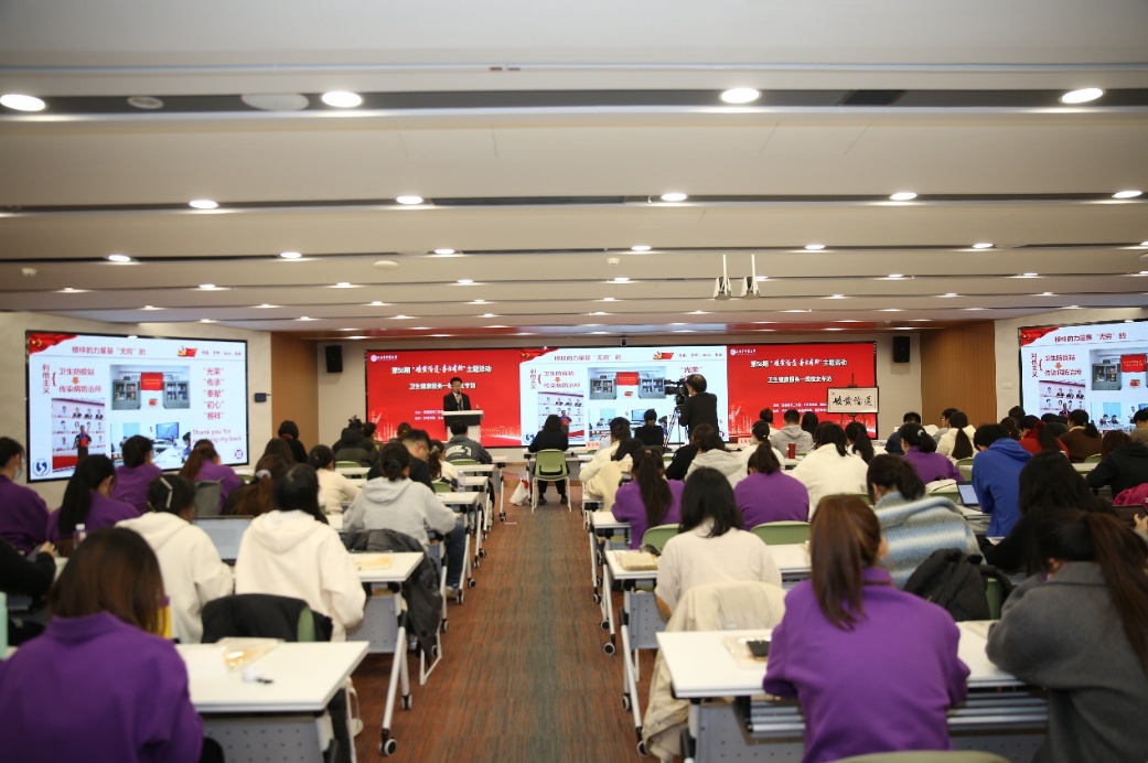 2022届预防医学专业校友董文彬,以《“公”而忘私、舍己“卫”人:从杏林校园到公卫战场》为题,讲述一线防控故事。作为上海市疾病预防控制中心传染病防治所医师,他入职三年来深度参与各类传染病现场流调处置工作超50次,连续三年坚守进博会保障一线,用1000余天的日夜坚守、33次重大活动“零感染”保障的实绩,践行着“上医治未病”的深刻内涵。他分享了与病毒赛跑的流调瞬间,讲述了团队“24小时待命、365天坚守”的无私奉献,更以“数据背后是鲜活的生命”的职业信念,诠释了公卫人“挡在传染病与人民群众之间的防火墙”的使命担当,让在场师生深刻理解了公共卫生“利他主义”的精神内核。