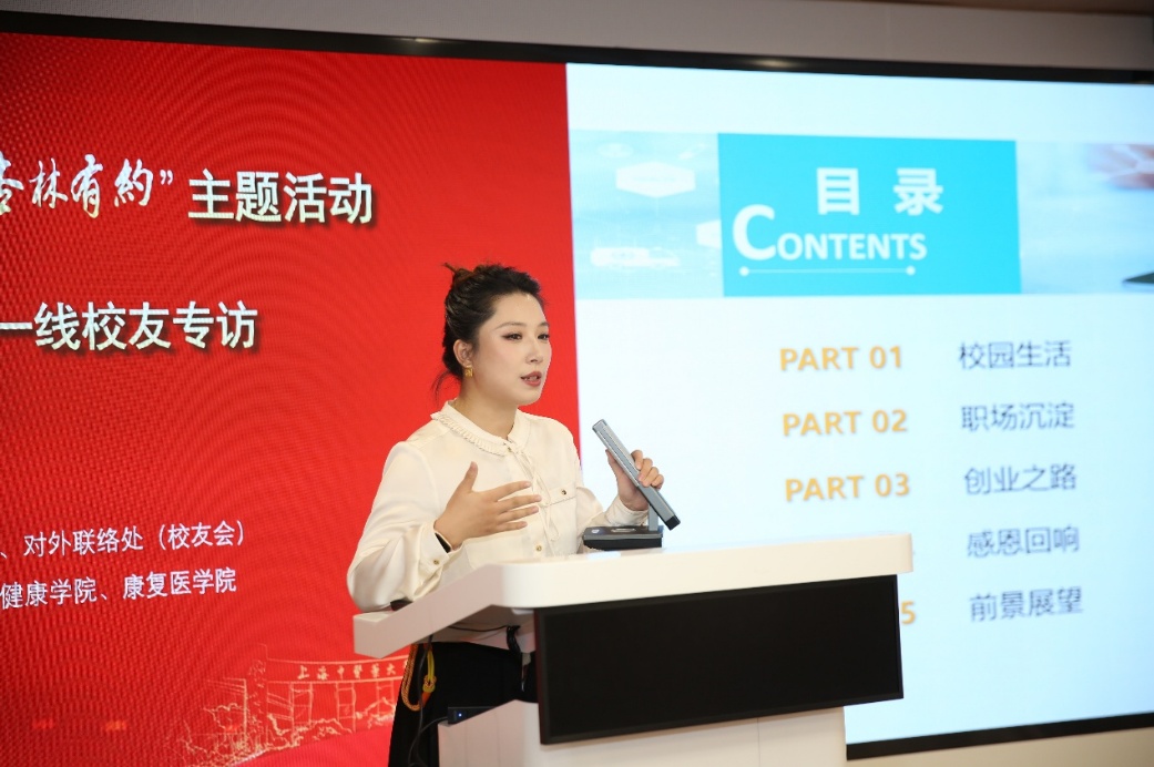 2017届康复治疗学专业校友王丽桢以《以专业铸根基,以热爱赴蓝海》为题,分享了从康复治疗师到创业先锋的蜕变历程。曾赴日本大阪医疗福祉专门学校访学的她,如今已是上海沃邦康复医学门诊部有限公司副总经理、联合创始人,同时担任康复医学院校友会理事与学生成长导师。她回溯了在母校打下的中西结合康复专业基础,讲述了从一线治疗师起步,深耕肌骨康复领域,带领团队从0到1打造邦能康复品牌的创业故事。面对康复行业供需缺口大的现状,她带领团队接轨国际治疗理念,研发专利康复产品,搭建“线上自测+线下诊疗”服务模式,年服务客群超10万人次,更以产学研基地、学生成长导师等身份反哺母校,用“深耕专业、大胆尝试、坚守初心”的箴言,传递着康复人的责任与担当。