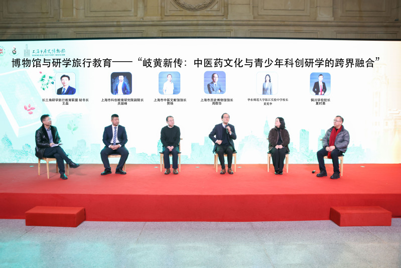 圆桌对话环节,长三角研学旅行教育联盟秘书长王磊主持研讨。上海市历史博物馆馆长周群华、上海市中医文献馆馆长贾杨、上海科创教育研究院副院长关韶峰、华东师范大学张江实验中学校长黄英华和铜川学校校长夏时勇,围绕“岐黄新传:中医药文化如何与青少年科创研学更好地跨界融合”主题展开讨论。